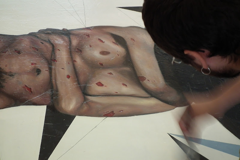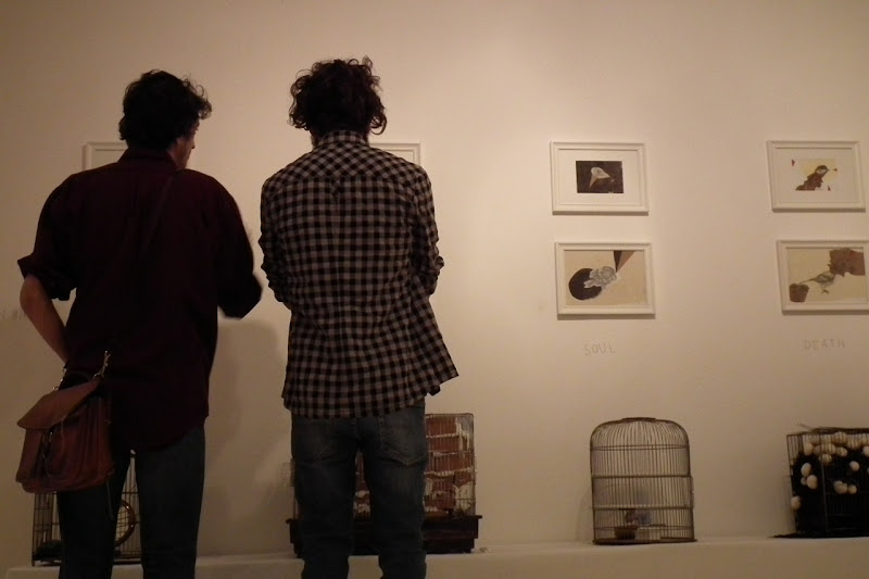 La poetica dell’autore prende forma attraverso la pittura, il disegno, il collage e l’installazione con disinvoltura, mostrandosi a noi in tutta la sua irruenza e portando con se l’eco di una certa tradizione surralista quanto le più recenti ricerche del tedesco Marco Wagner, dell’americana Elizabeth McGrath e dello svizzero Lèopold Rapus.I suoi ibridi sono cartine da tornasole attraverso cui guardare ai nervi scoperti della società, la sua visionarietà, nel rigore, si fa invito alla consapevolezza. “Tra Bestia e cielo” è l’urlo straziante di un’umanità i cui corpi spezzati, dondolanti, innestati, contriti e rannichiati assumono le sembianze di bestie umanizzate o uomini zoomorfizzati. Una Natura matrigna quella rappresentata da Nicola Alessandrini. Un urlo primordiale o la ripicca di una Natura che si impossessa dell’umanità piegandola alle sue più istintive manifestazioni di bestialità. Una parabola che scavalca l’ideale armonioso di uomo immerso nella Natura benigna, per diventare spinta incontenibile all’azione, impulso alla distruzione fuori e dentro di noi. Una Natura che non conforta, che ricade sull’uomo come una punizione da espiare, una sorta di nuovo peccato originale. E così i due trittici realizzati da Alessandrini portano nel loro dna una sacralità conturbante. Una divinità-bambino offerto in sacrificio, o nel bel mezzo di una mutazione, si offre come corpo monco, sfigurato e sacrificale all’adorazione e letteralmente “in pasto” a uomini belve urlanti e contorte nella loro disperazione. In un continuo via vai di rimandi fra trinità, sacra famiglia, cannibalismo, contese, soprusi, volontà di appropriazione e possesso dove i due, un uomo e una donna lupo, rimangono schiacciati dalla loro stessa condizione sociale, dal loro essere carnefici. Un umanità, quella di Alessandrini, che, più di muovere il sole e le altre stelle, sembra rimanere incastrata sotto il peso delle sue stesse ombre. Segue la serie “corpi celesti”, una sorta di aldilà, uno spazio altro- lo si vede già dalla geometria frattale della terra che ospita i protagonisti- dove va in scena una rivisitazione/riflessione sull’origine del mondo. Una scimmia triclope, i cui rimandi vanno da “2001 Odissea nello spazio” al “Pianeta delle scimmie”, domina impunemente la scena, con accanto due moderni Adamo ed Eva dai visi avvolti in celesti nebbie fra brandelli di carni sezionate e brutalità in azione. Siamo già ben lontani dal Paradiso Terrestre, ben fuori dalle delizie della salvezza… L’ultimo ciclo di lavori è quello degli “uccelli”, a prima vista, più silenzioso e sussurrante. Disegni e collage, di dimensioni ridotte rispetto alla monumentalità degli altri lavori in mostra, dove ibridi uccelli/piante senza testa, intrecciano un dialogo, con delle gabbiette bianche nelle quali resti, brandelli di memoria culturale/tecnologica, raccontano di un’umanità oramai volata via, di cui rimane appena un ciuffo di capelli e poco più, in un silenzio siderale ancor più rumoroso…